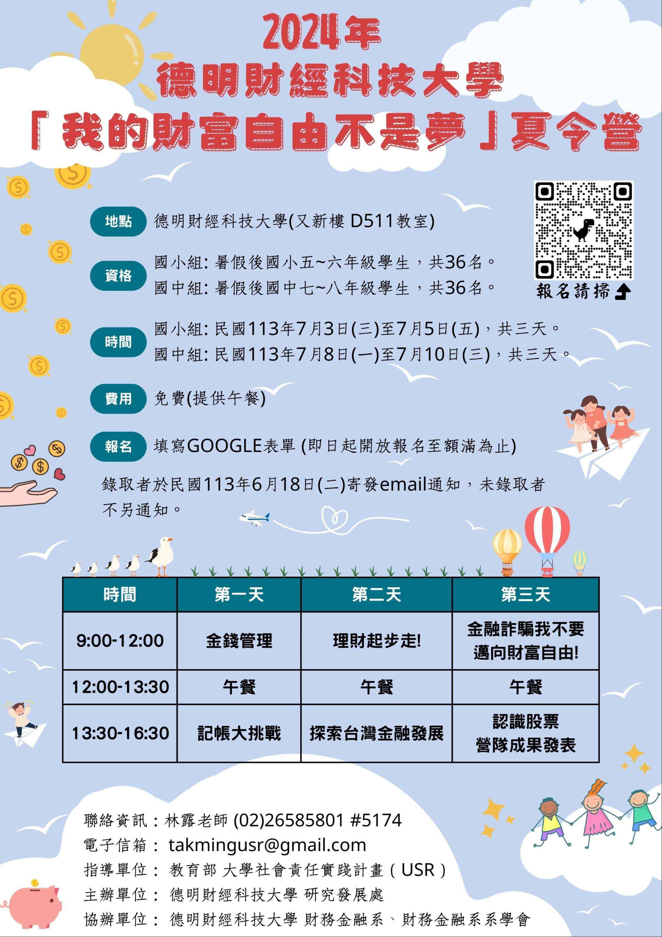 二、旨揭活動期以營隊方式從小扎根財經素養,宣導正確金融 知識,將基礎理財觀念結合桌遊、遊戲、小組活動及參訪 活動啟發學生之財經智慧,建立正確的金錢觀。