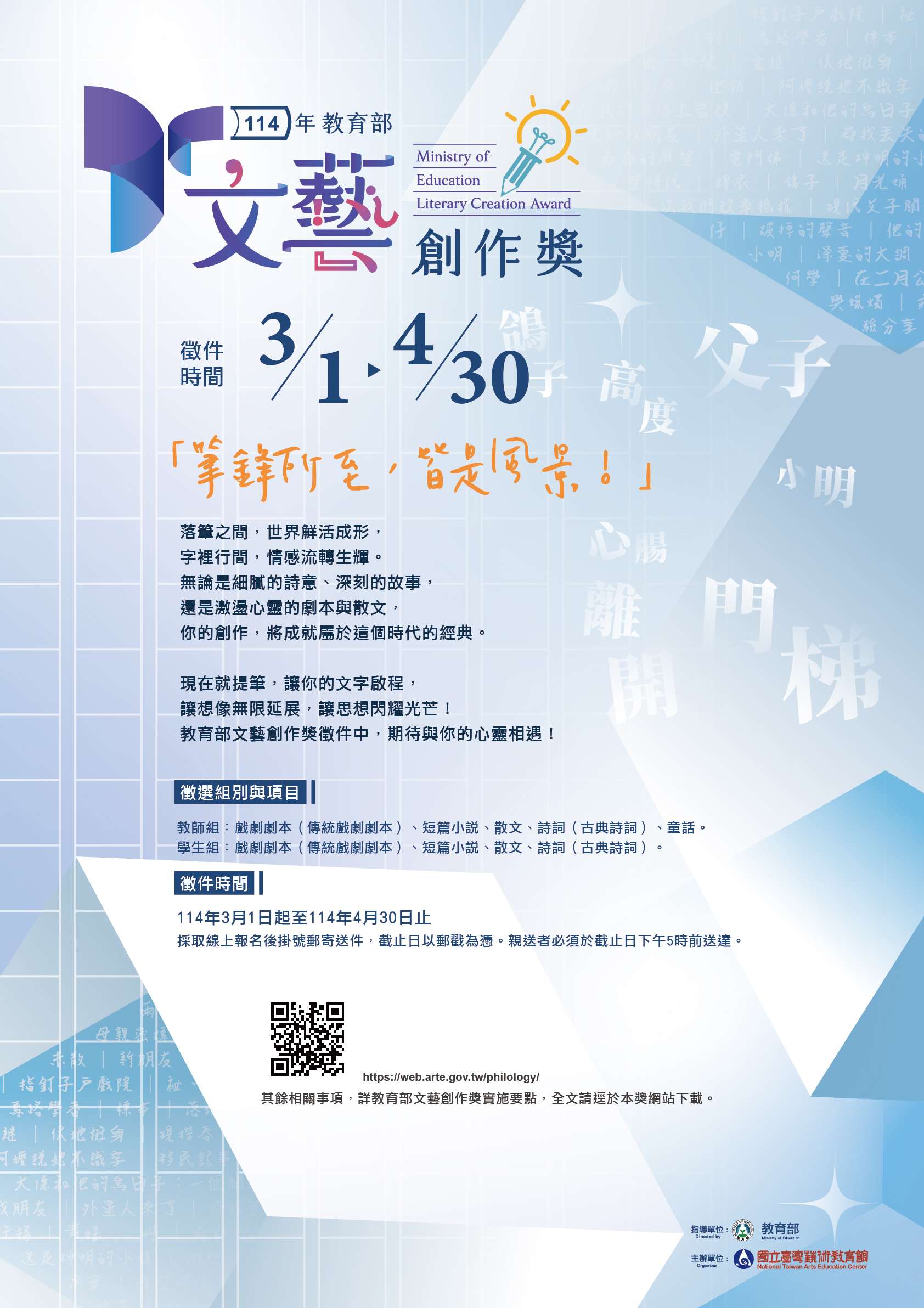 六、參選受理期間:自114年3月1日起至114年4月30日截止,採 取先線上報名(網址:https://web.arte.gov.tw /philology/),後以掛號郵寄送件方式辦理,截止日以郵 戳為憑;親送者必須於截止日下午5時前送達。