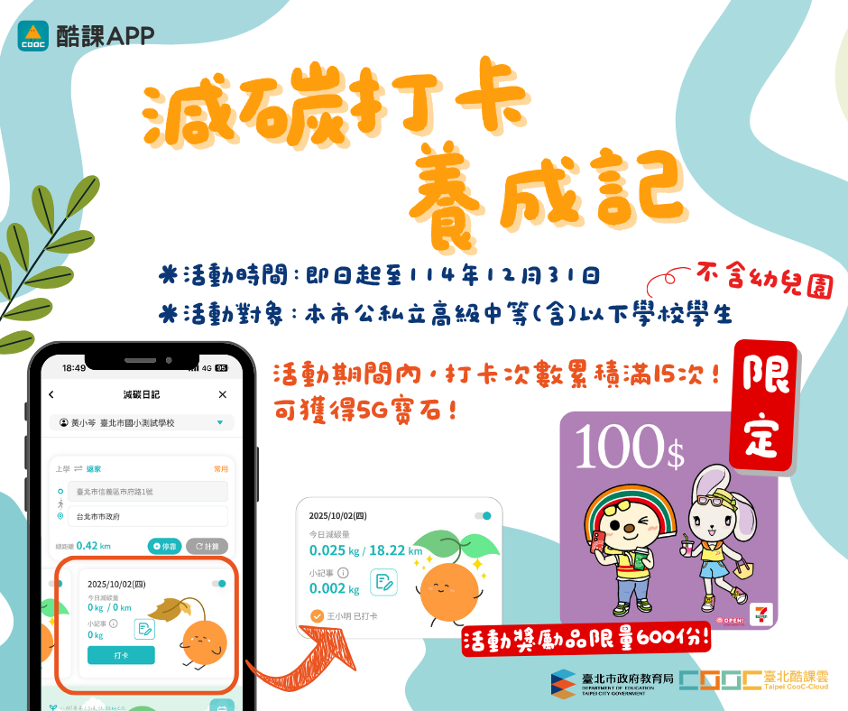 臺北市政府教育局建置「親師生平臺/酷課APP」,提供本市親師生各項服務,為配合臺北市淨零排放管理自治條例推動低碳上學,今年度推出減碳日記功能,鼓勵學生透過紀錄通學路程,由系統協助計算減碳量,讓親師生能一同掌握學生減碳量。
