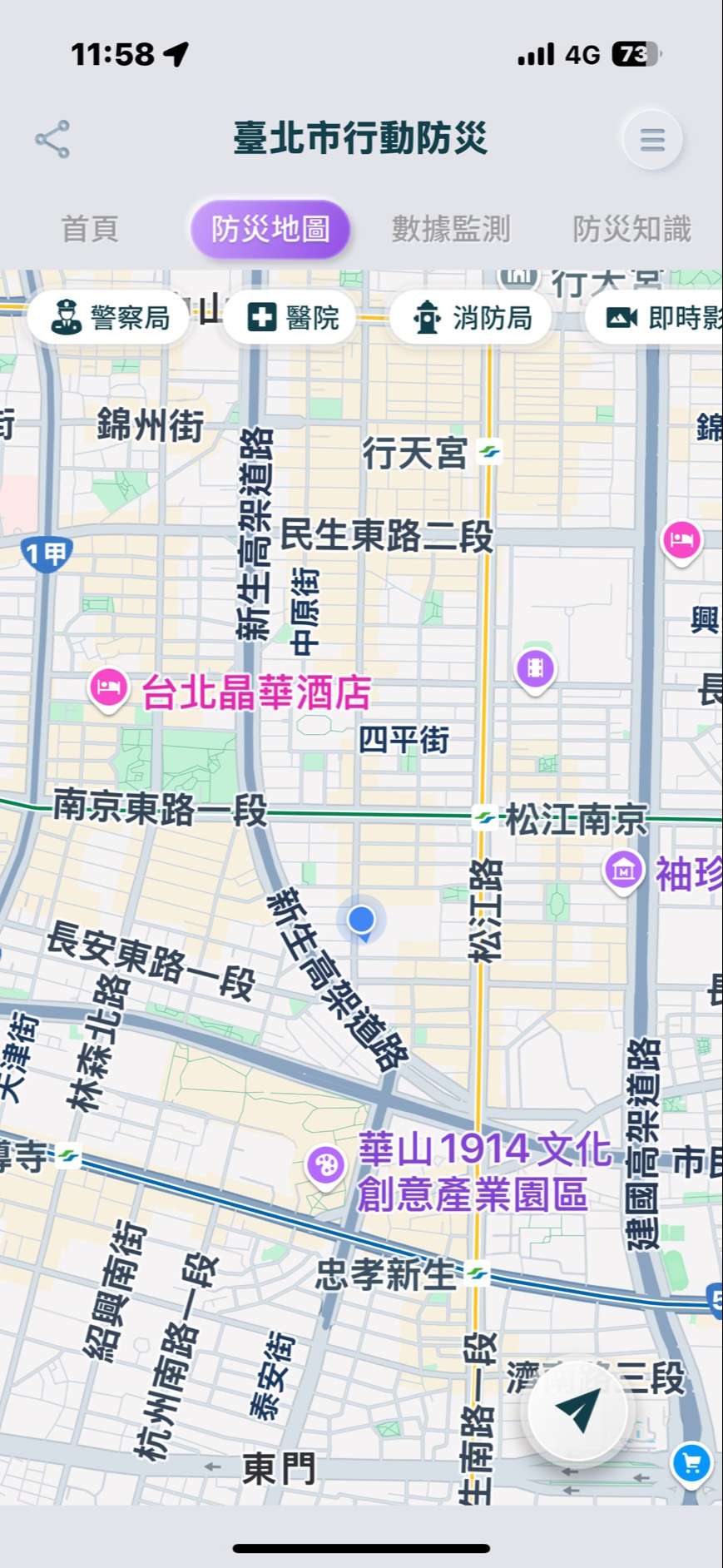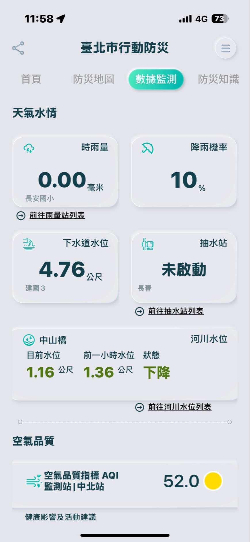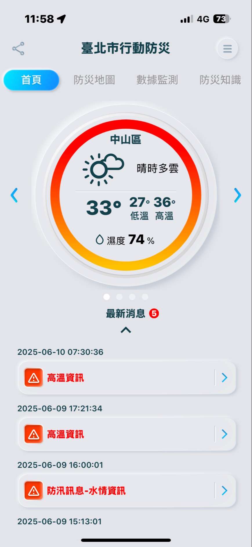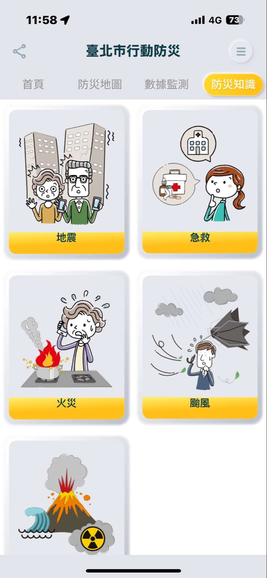 「臺北市行動防災App」包含Android平臺及iOS平臺2種版本,具有氣象雲圖、防災地圖、雨量資訊、水位資訊、影像資訊、避難資訊及防災宣導等功能。