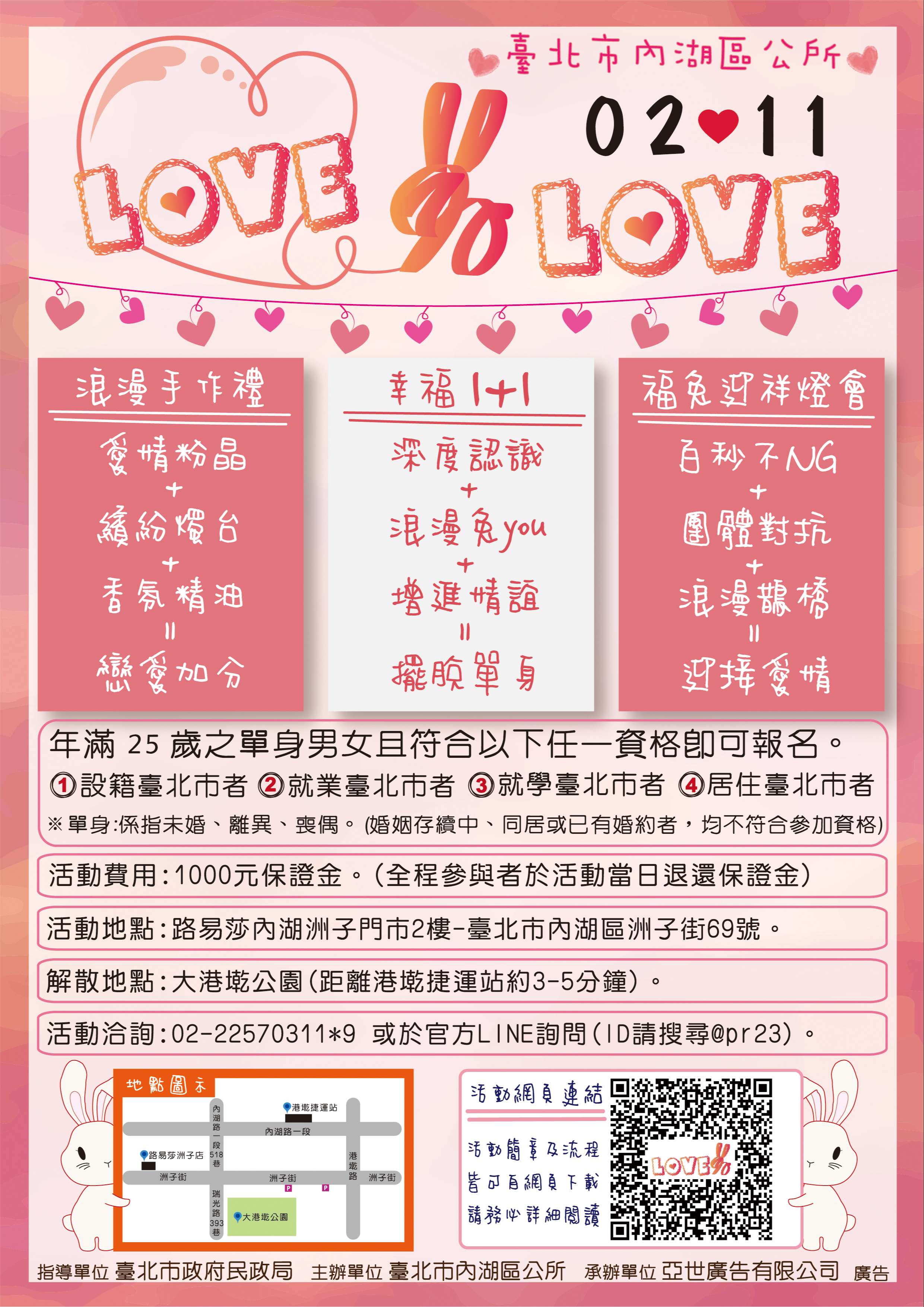 臺北市內湖區公所將於112 年2月11日(六)下午12時30分至19時舉辦單身聯誼活動, 活動名額為男、女性各20人,共40人,歡迎年齡年滿25歲 以上,設籍於本市或於本市就業、就學或居住之未婚市民 踴躍報名參加,詳情請見內湖區公所官網最新消息或電洽 (02)27925828轉605內湖區公所洪小姐。