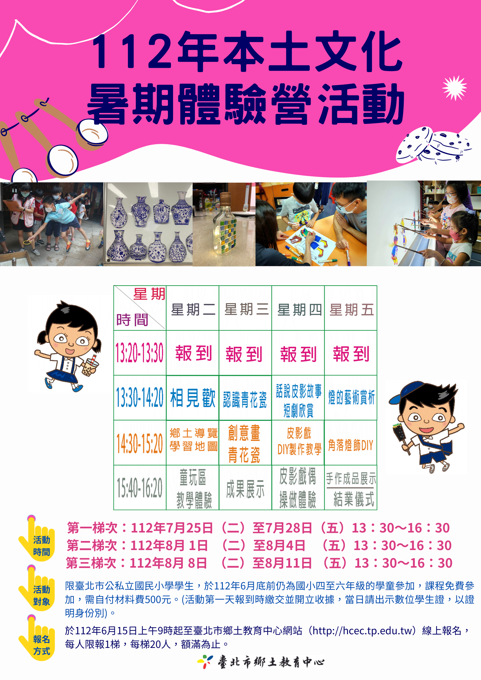 二、旨案依據臺北市鄉土教育中心112年度工作計畫辦理,活動 相關資訊如下: