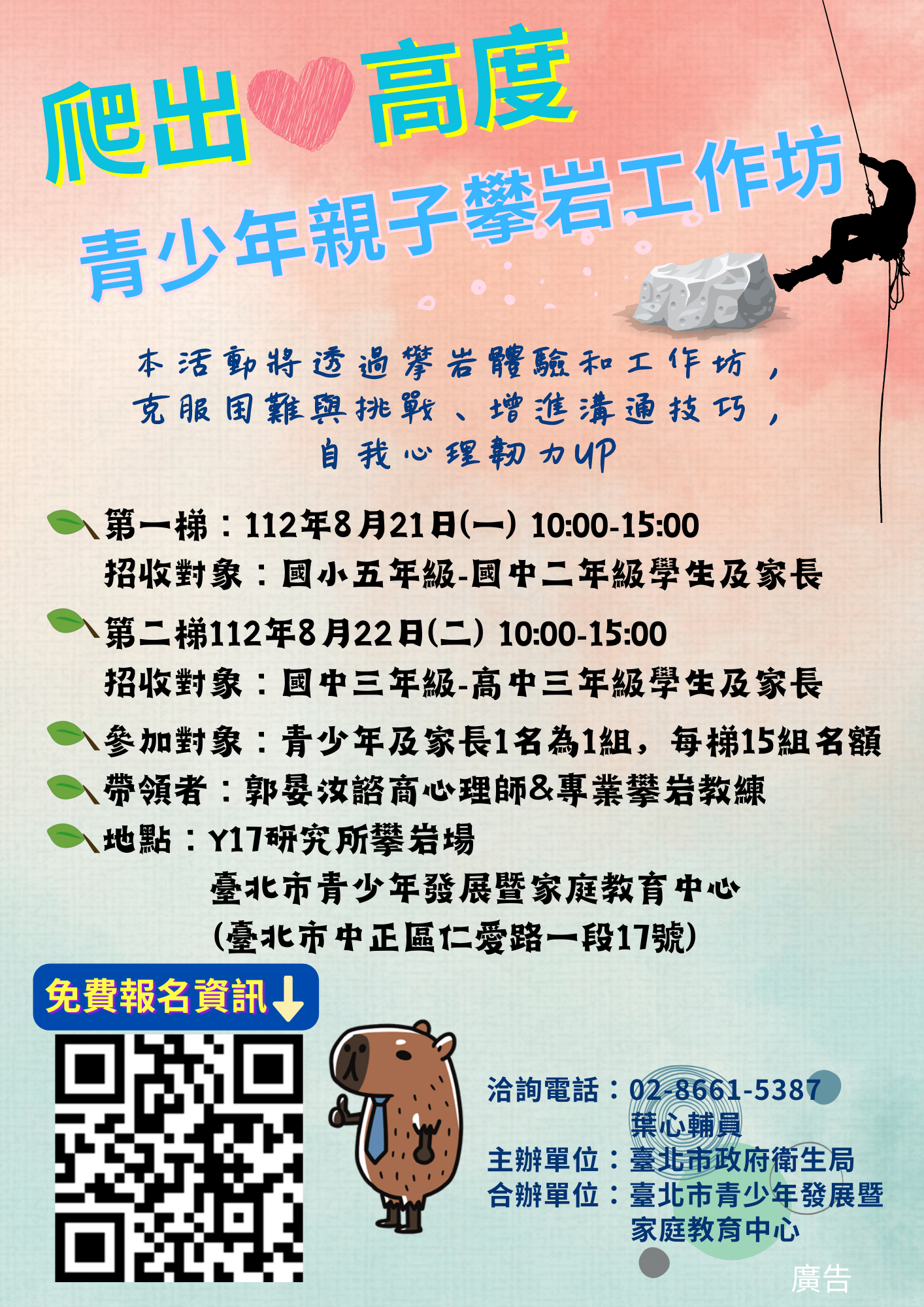 活動名稱:「112年度暑期青少年親子攀岩體驗活動」