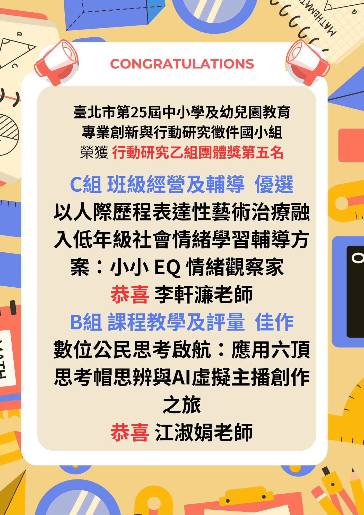本校參加臺北市第25屆中小學及幼兒園教育專業創新與行動研究徵件