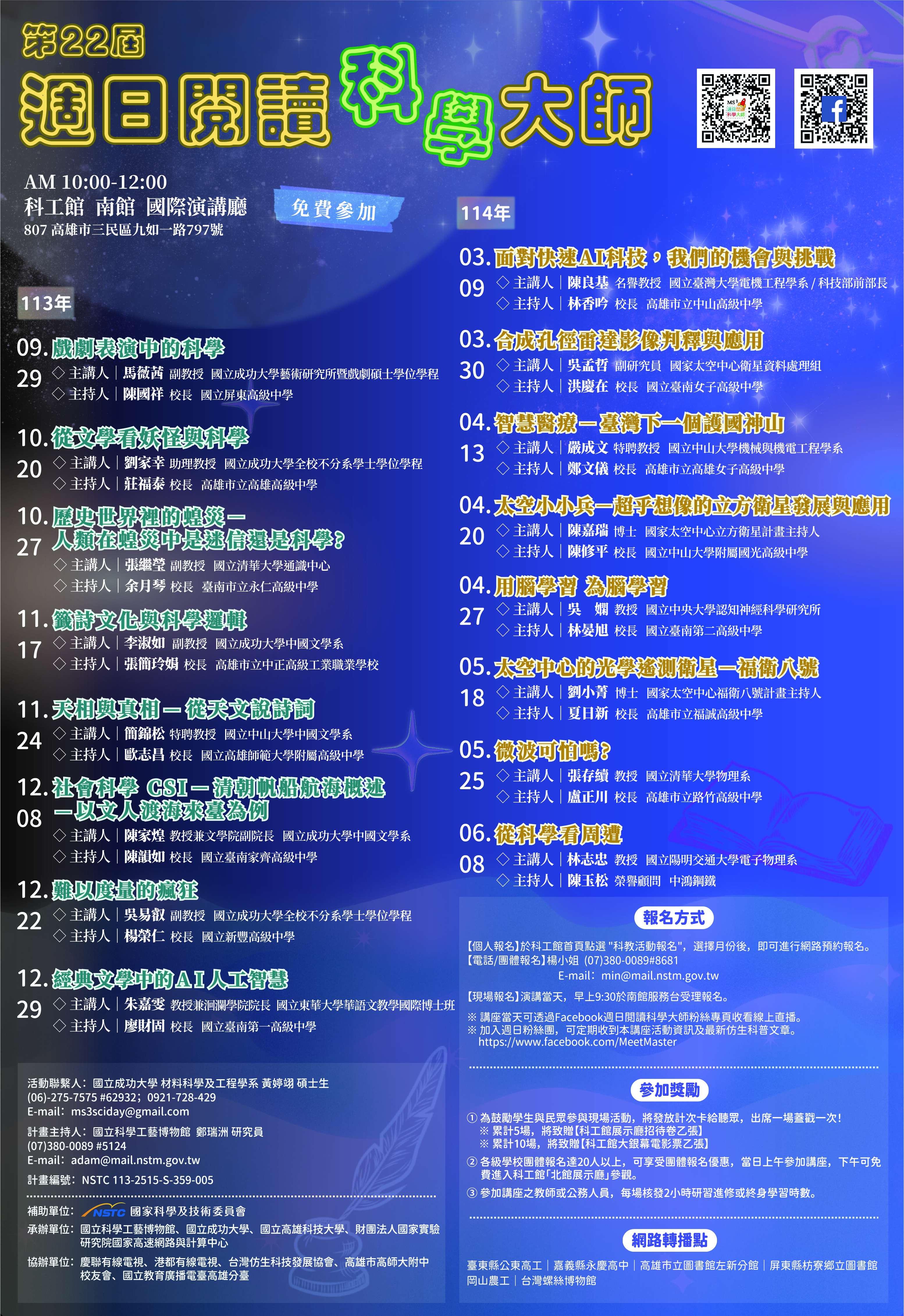 二、「週日閱讀科學大師」講座是專為年輕朋友及社會大眾辦理之科普活動,目的為引發學生及社會大眾對於科學的理解、興趣及參與,以增進其科學素養。