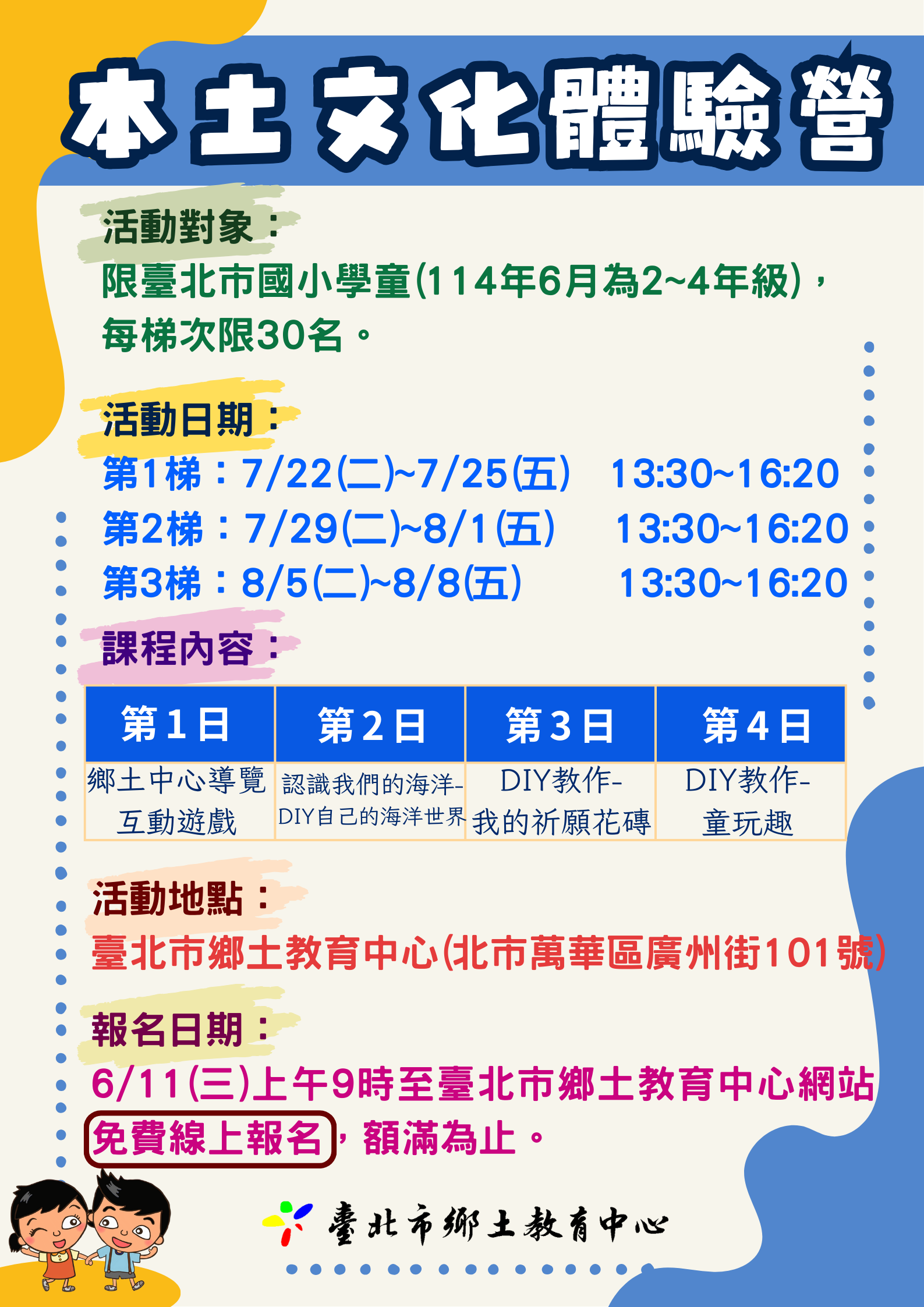 二、臺北市鄉土教育中心利用暑假舉辦免費「本土文化體驗 營」,以提供本市學童深入學習多方面的本土文化知識, 進而達到中心推廣本土教育、深根在地文化目的。