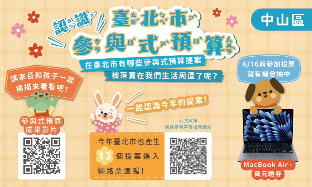 二、本案規劃於本市提案票選活動期間(114年6月2日上午9時 至114年6月16日下午5時止),鼓勵學童和家長共同參與, 製作本宣傳貼紙,期親子透過觀看影片,認識貴校所在地 行政區提案成果。