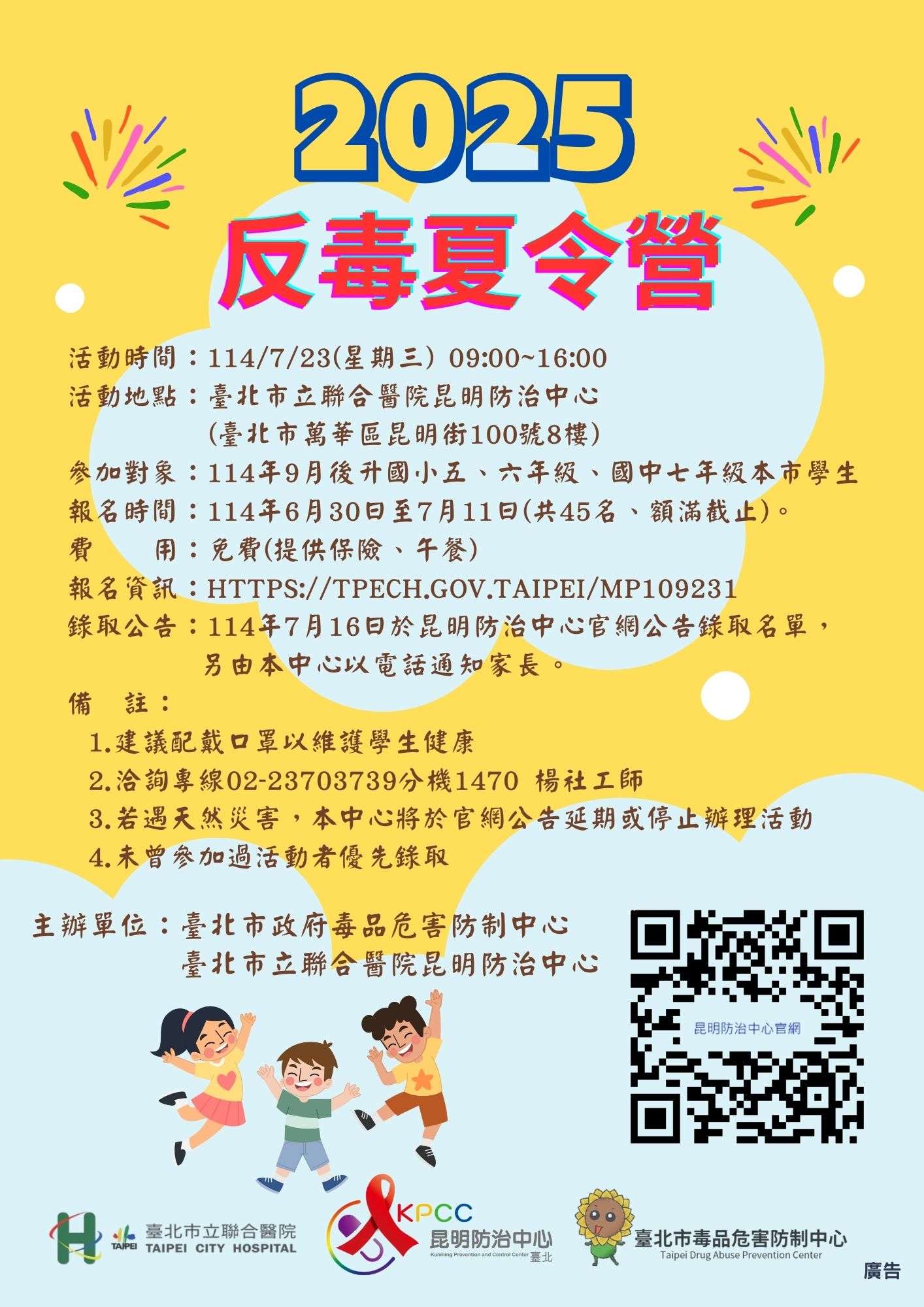 八、檢附營隊宣傳海報1份,請協助公告宣傳,相關報名資訊可 至昆明防治中心官網查詢(https://tpech.gov.taipei /mp109231)。