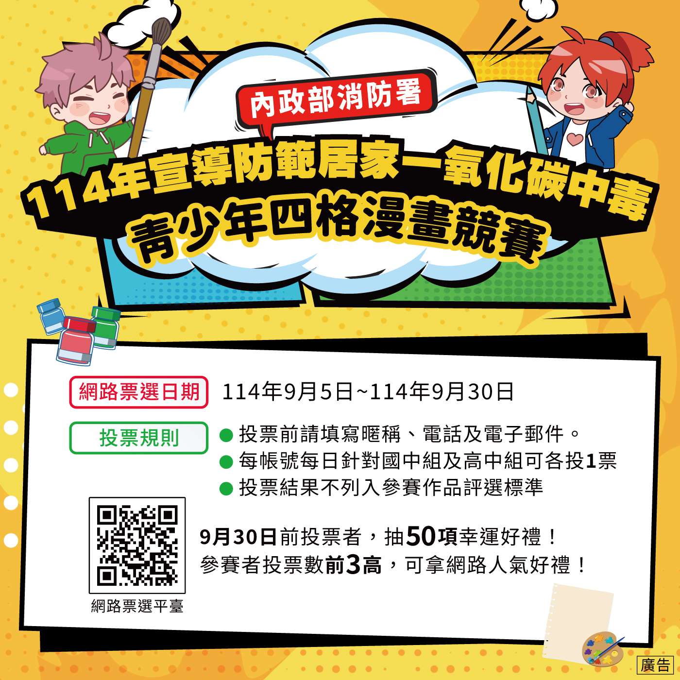 一、依據本府消防局114年9月11日北市消預字第1143042150號 函辦理。 二、旨揭票選活動期限自即日起至114年9月30日止,請協助宣 導並鼓勵學生踴躍投票。