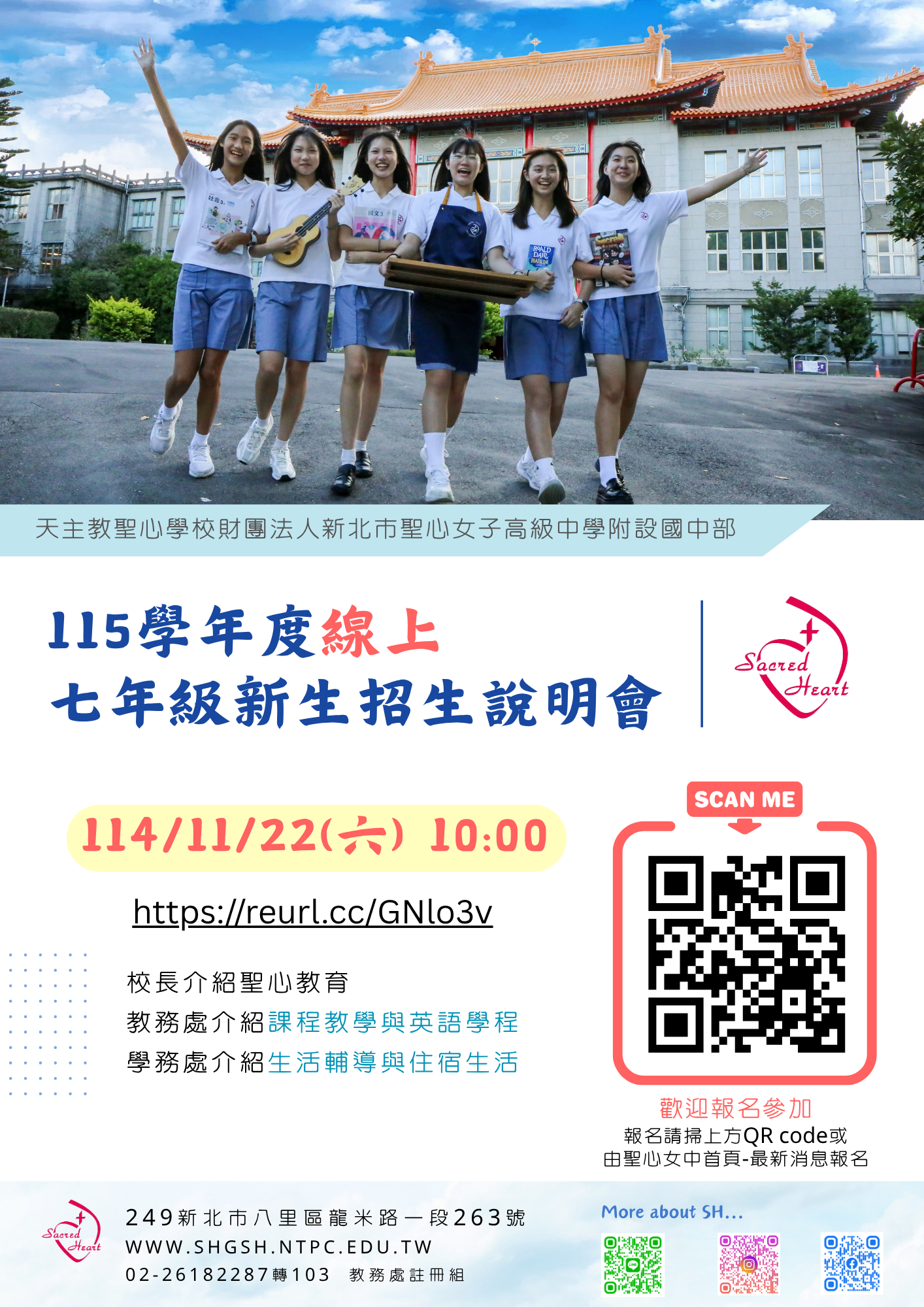 主旨:檢送本校(天主教聖心學校財團法人新北市聖心女子高級中學)辦理115學年度七年級新生線上招生說明會,敬 祈 貴校協助公告並鼓勵六年級女學生及家長踴躍報名, 請查照。