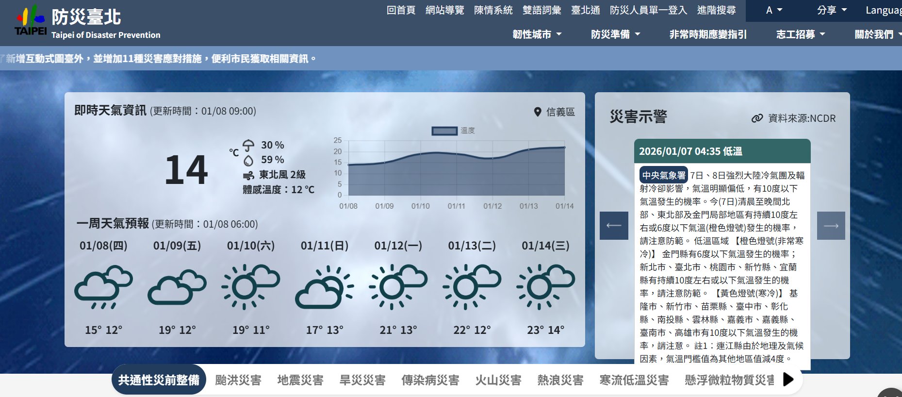 網站改版依「災前整備」、「災中應變」、「災後復 原」三大架構配合11類災害類別重新設計,全面導入圖像 化互動式內容,介接動態示警資訊,民眾可即時接收最新 的災害訊。